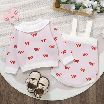 Girls Baby Knitted Sweater and Bodysuit Set - Fashion Bow Cardigan + Romper 2pcs